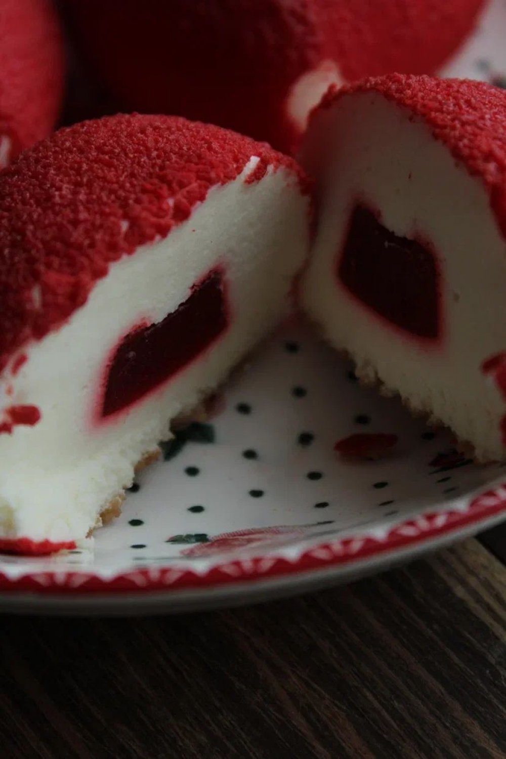 Муссовые пирожные сделанные на основе белого шоколада, сливок и клубники.