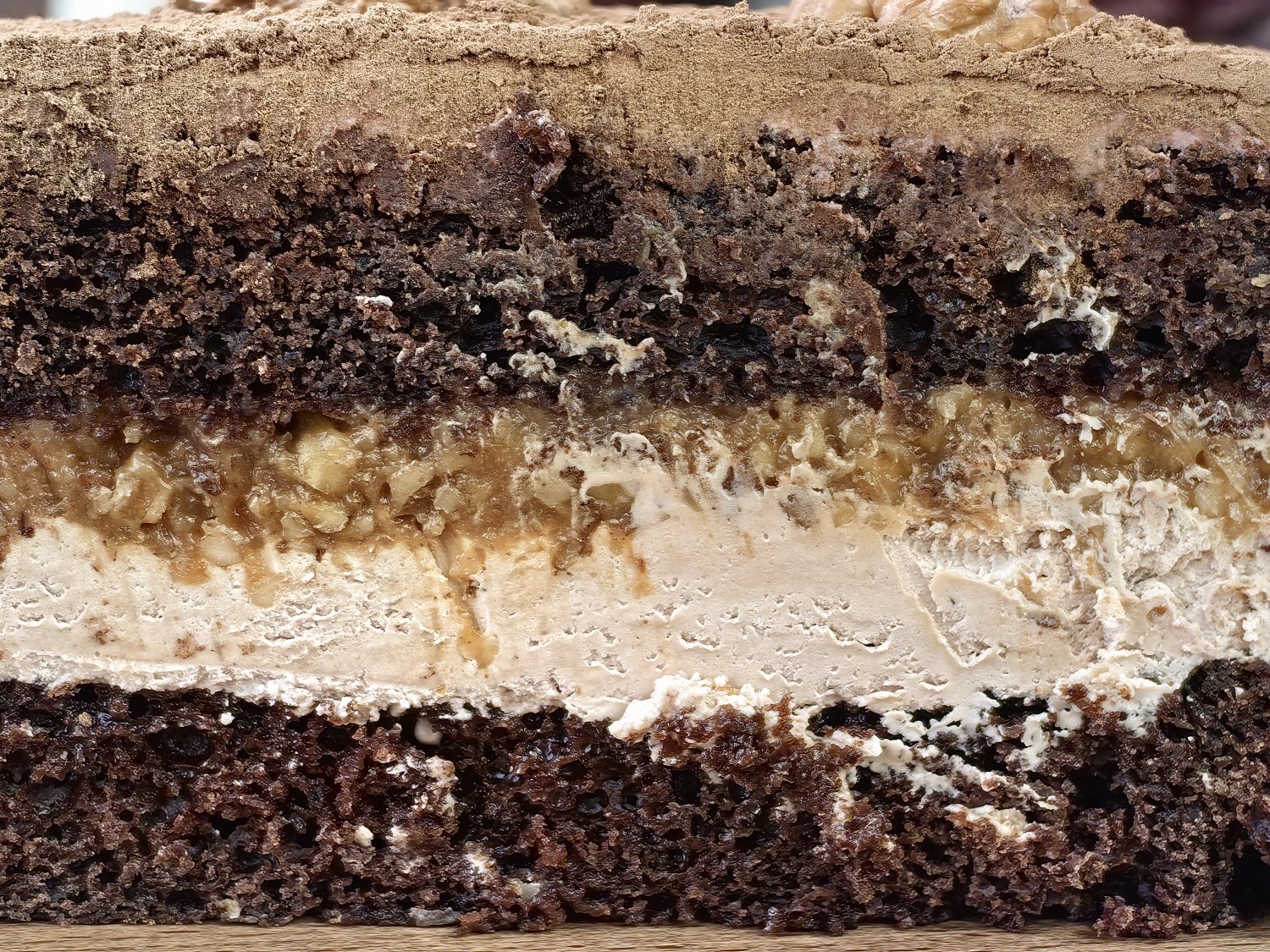 Шоколадный бисквит на кефире, карамель с грецким орехом, шоколадный крем на основе молочного шоколада. Масса: 1100 гр.